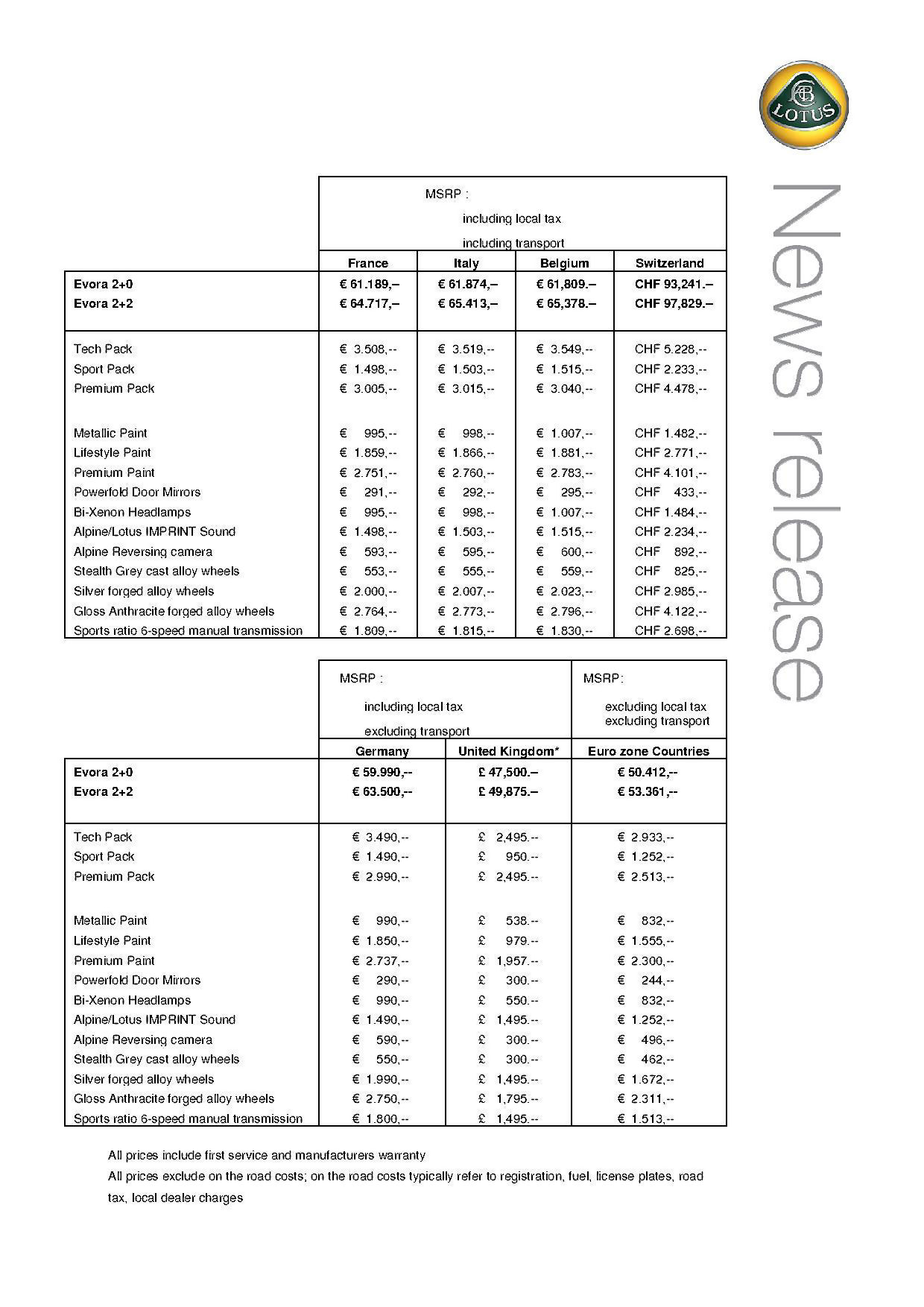 3 March 2009 The 2010 Model Year Lotus Evora Range Specification and Pricing(EU and Switzerland) |
